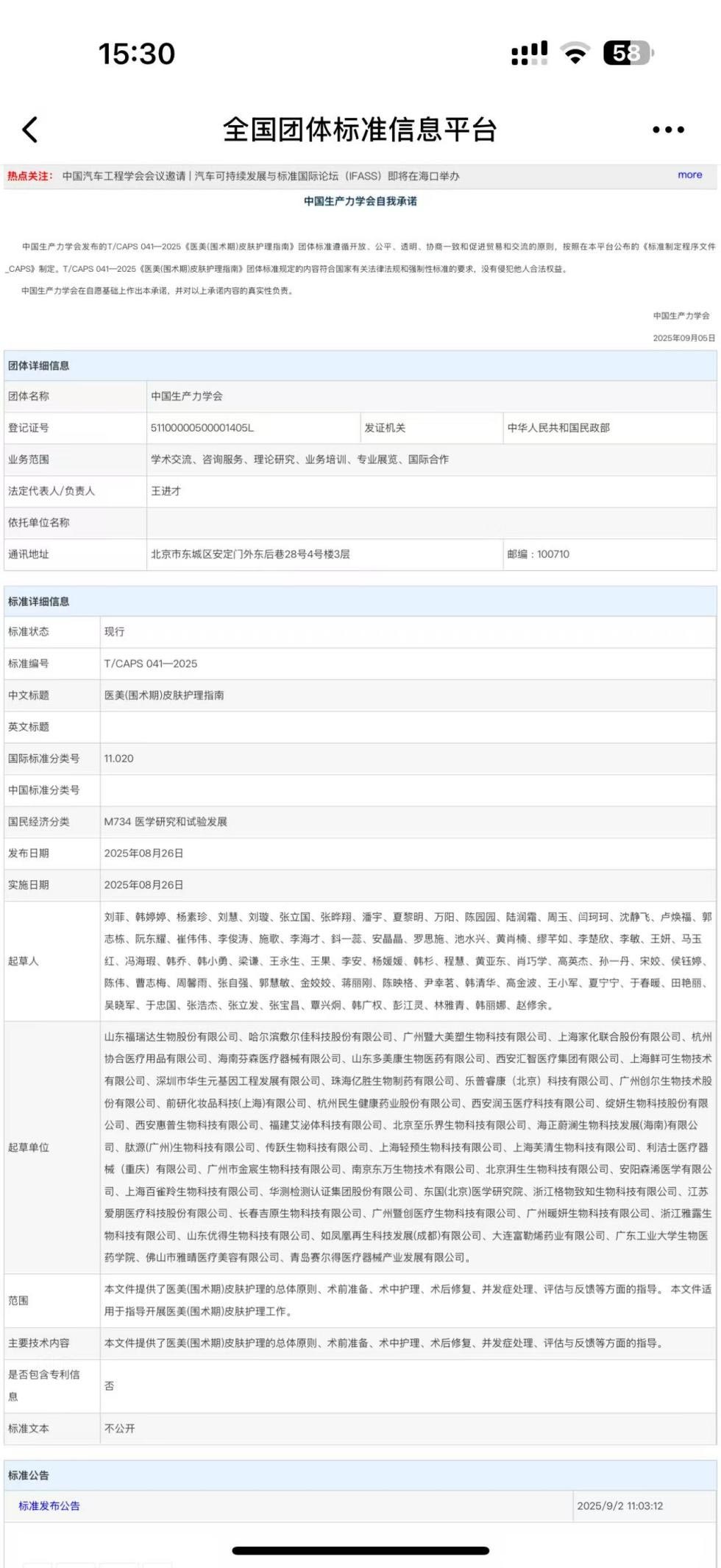 On August 26, 2025, the group standard "Guidelines for Skin Care in Medical Aesthetics (Perioperative Period)" (standard number: T/CAPS 041 - 2025), jointly drafted by the China Productivity Society and several leading companies in the industry, including Qingdao Saildar Medical Device Industry Development Co., Ltd., was officially released and implemented. This event marks a key step forward in the standardization of my country's medical aesthetics industry and also injects strong momentum into the development of Qingdao Saildar Medical Device Industry Development Co., Ltd.